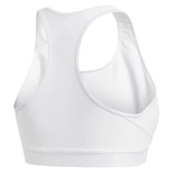 This sports bra helps keep everything in place so you can focus on your workout. The stretchy knit bra has a compression fit that offers medium support. The mesh panel in back keeps air circulating to cool you down. Medium support offers a close fit with compression and a pullover design. Scoop neck & racer back design. 83% recycled polyester / 17% elastane double knit. adidas have created Alphaskin for a locked-in feel.